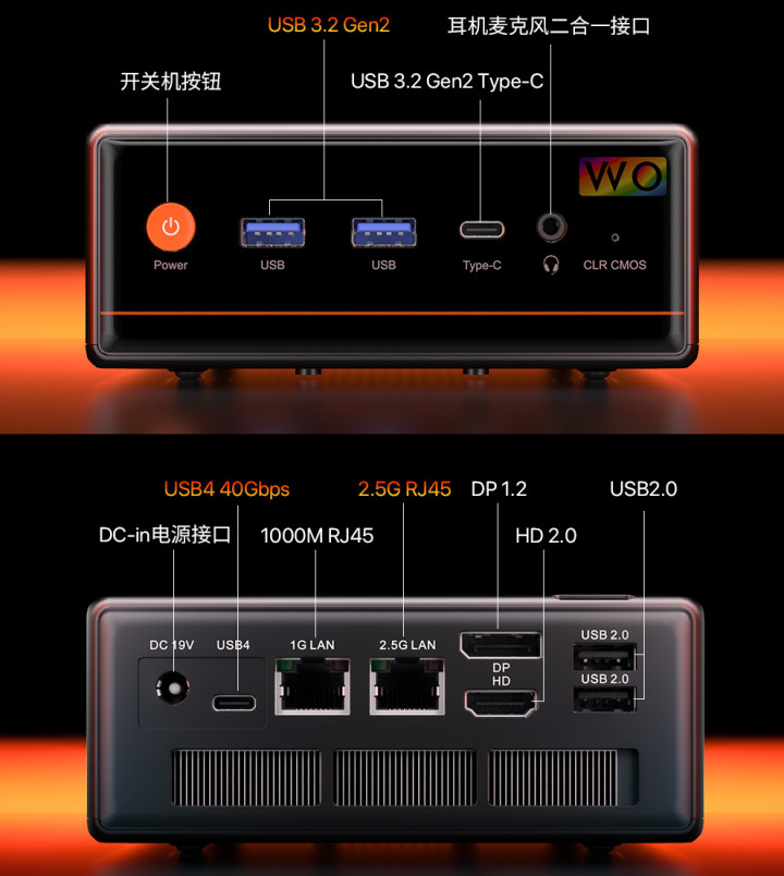 在接口方面,磐镭WO4 7640HS迷你主机充分考虑了用户的多样化需求。主机前置配备1个USB 3.2 Gen2 Type-C接口、2个USB 3.2 Gen2 Type-A接口和1个3.5mm Audio Jack耳机麦克风二合一接口,后置则有1个USB4 Type-C接口、1个HD2.0接口、1个DP1.2接口、1个2.5G网口、1个1000M网口以及2个USB2.0接口。此外,主机还搭载Wi-Fi 6无线网卡,支持蓝牙5.2。